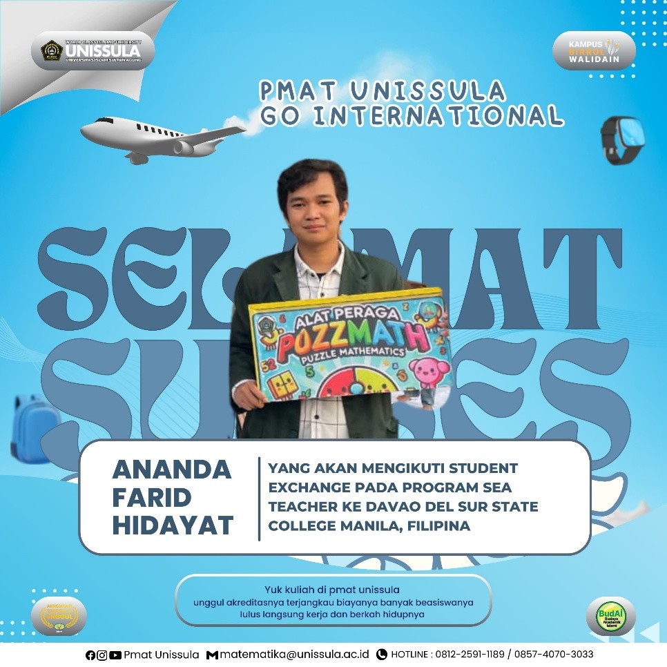 Mahasiswa prodi Pendidikan Matematika Unissula, Ananda Farid Hidayat, berhasil lolos Program student exchange SEA Teacher. Melalui program tersebut ia dapat melaksanakan Praktik Pengalaman Lapangan (PPL) Internasional di Davao del Sur State College, Manila, Filipina.
