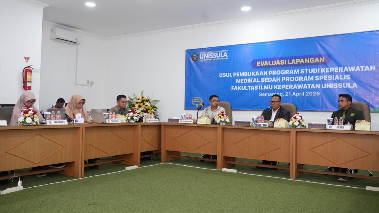 Fakultas Ilmu Keperawatan (FIK) Unissula menerima evaluasi lapangan atas usul pembukaan program spesialis keperawatan medikal bedah, Selasa (21/4/2026). “Terimakasih atas kehadiran tim evaluator lapangan di FIK Unissula. Adapun nanti jika ada perbaikan-perbaikan dari tim evaluator saya selaku rektor untuk sesegera mungkin memperbaikinya. Karena cita-cita kami bersama FIK sangat tinggi untuk melahirkan program studi baru, yaitu Spesialis Keperawatan Medikal Bedah,” ungkap Rektor Unissula Prof Dr Gunarto SH MH.