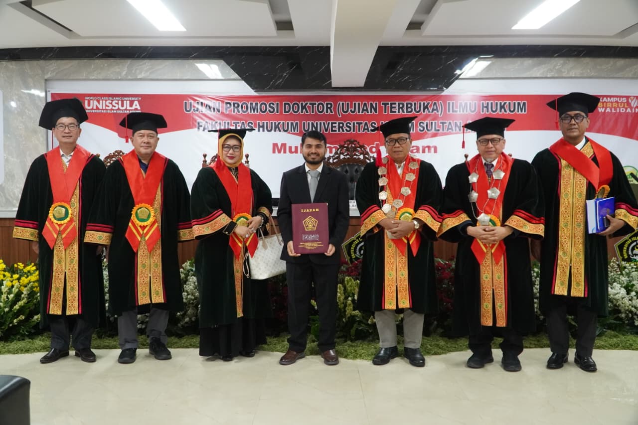 Muhammad Azam mahasiswa Program Doktor Ilmu Hukum (PDIH) resmi meraih gelar doktor setelah sukses menjalani Ujian Promosi Doktor di Fakultas Hukum Unissula. Mahasiswa asal Pakistan tersebut lulus dengan Indeks Prestasi Kumulatif (IPK) 3,99, Senin (2/3/2026).